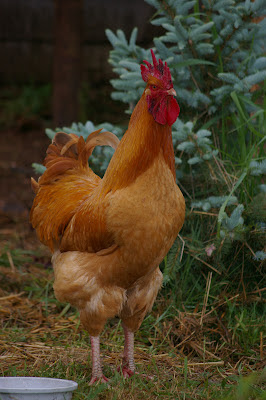 Along with fencing in the yard, Jim has helped Sis make one of her dreams come true. Sis has wanted chickens for years (only God knows why). He built a chicken coop around her flower garden on the other side of the driveway and fenced it all in. Last weekend he went to an auction and brought home six Barred Rock chickens. They are black and white (kinda salt and pepper) with red combs and are great egg layers. We had been getting all the fresh eggs we could use, and then some, from Sis's good friend Joanie. Chicken eggs of all colors, duck eggs, and goose eggs (HUGE!!). There is a massive difference between fresh eggs from a farm and the eggs you buy at the store. And I mean massive as in the Grand Canyon massive. If you have never tried them, do it. You will never want to use eggs from the store again. Joanie and her husband are moving soon and have decided they don't want to have birds anymore, so they gave us their spectacular rooster, Elvis, and four hens. We will also be getting her six ducks and three geese just as soon as Jim finishes building their pen next door to the chickens. In addition, Jeremy's kids bought Sis a super cool rooster that is a cross between a Silkie and a Polish Crested. His name is Lloyd.
